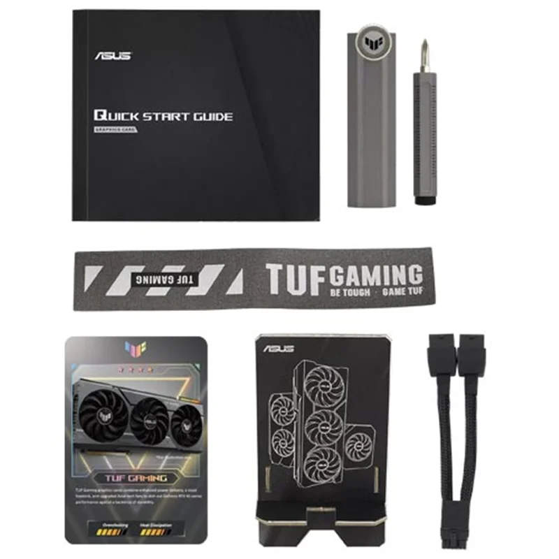 نگهدارنده کارت گرافیک TUF، نوار چسب TUF، کابل آداپتور یک به دو، کارت گارانتی، دفترچه راهنما