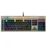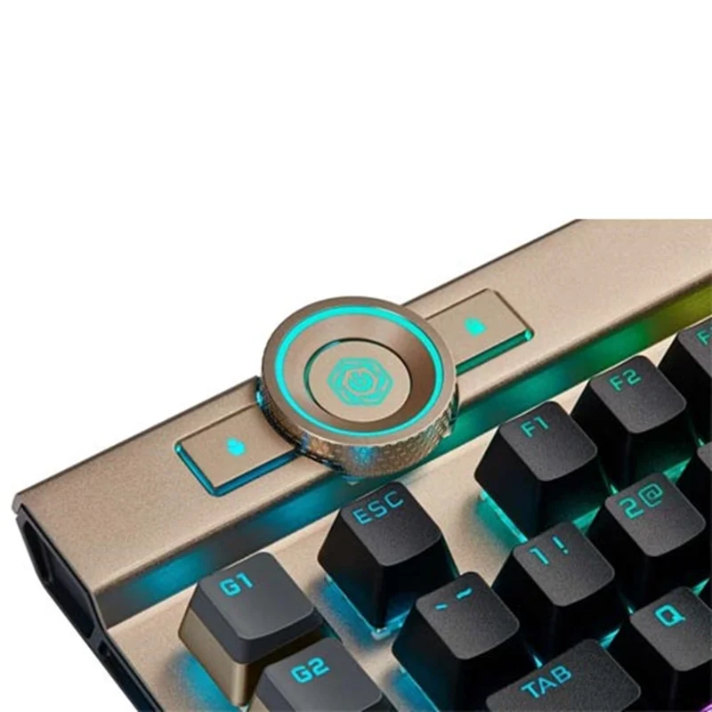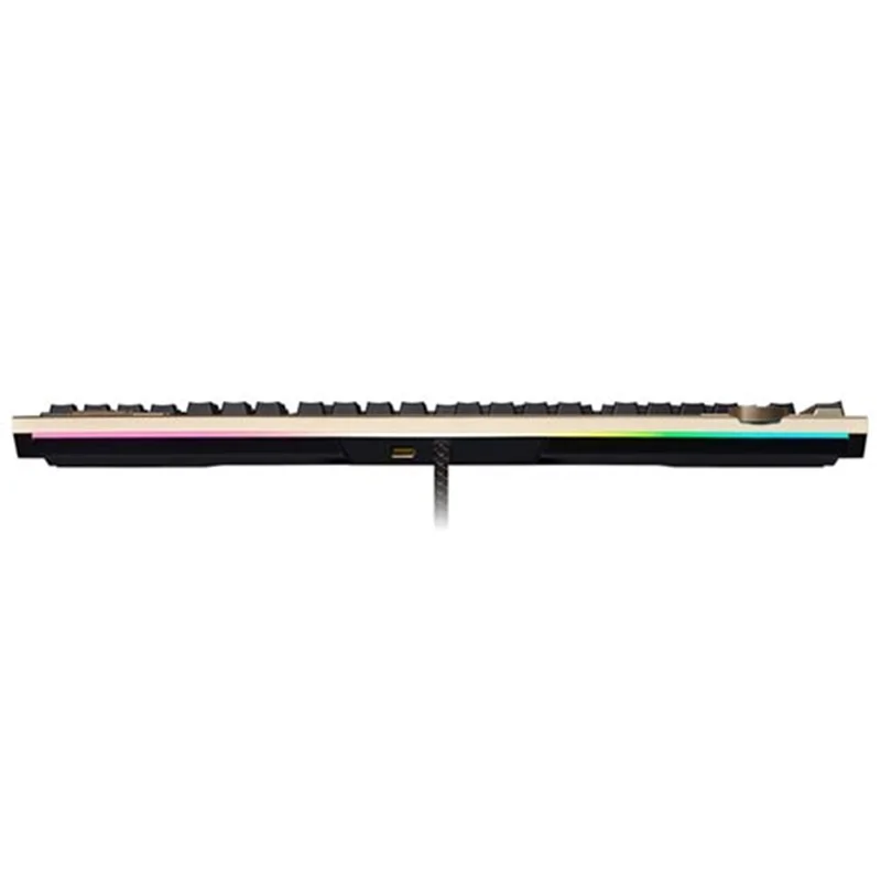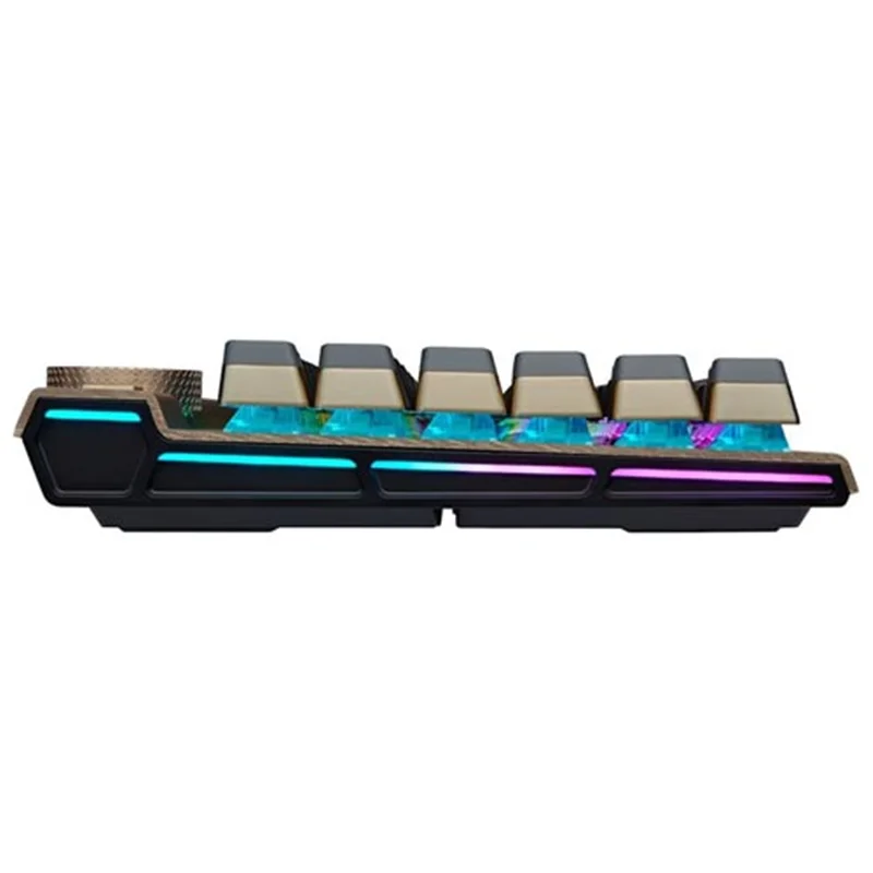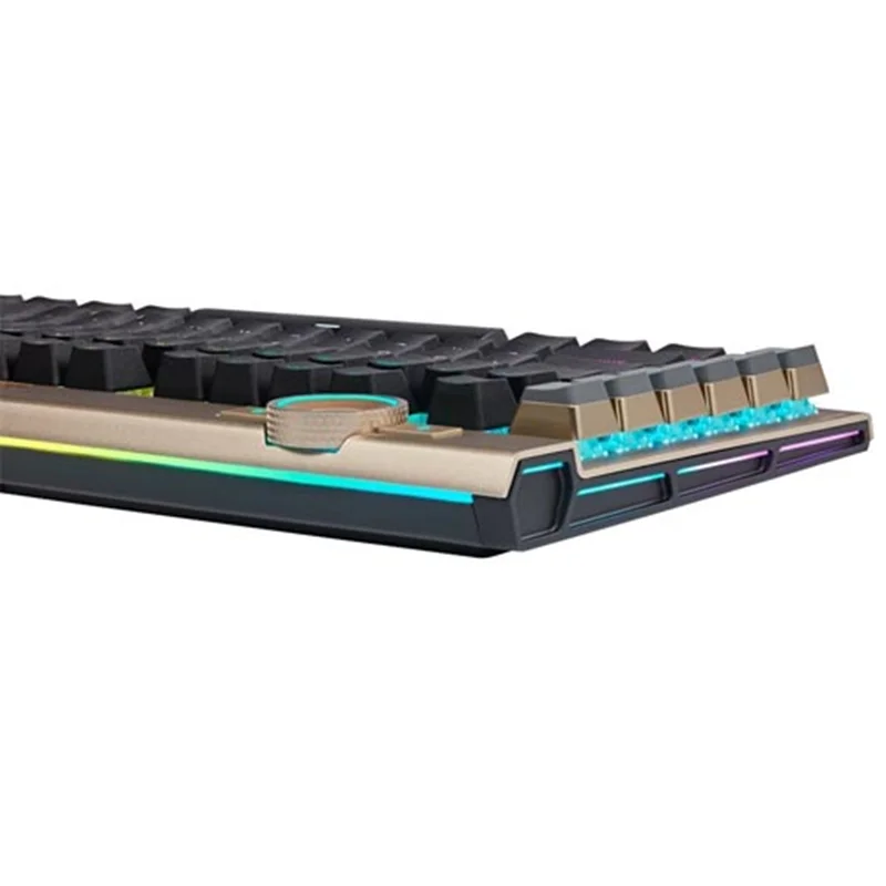 • شاسی فلزی با روکش آلومینیومی طلایی بادوام، سرکلیدهای برجسته طلایی و سیستم نورپردازی Per-Key RGB با 44 ناحیه و سه گوشه صفحه کلید