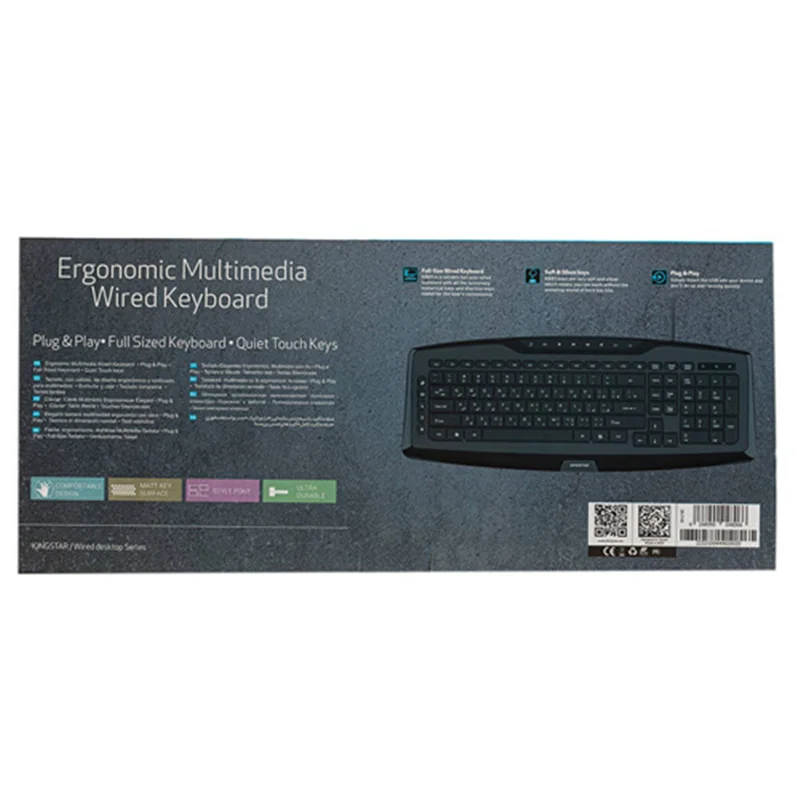 کیبورد کینگ استار مدل kb83 از نوع سیم دار میباشد و از طریق درگاه USB به کامپیوتر متصل میشود. این کیبورد دارای 104 کلید برای انجام فعالیتهای کامپیوتری است. همچنین کیبورد kb83 دارای 13 کلید میانبر به منظور انجام سریعتر کارهاست که عبارتند از Web Home, email, Search, Refresh, Favorite, Music, Play/Pause, Stop, Pre. Track, Next Track, Mute, Volume. کیبورد کینگ استار مدل kb83، برای استفادههای روزمره مناسب است. از دیگر ویژگیهای این کیبورد محصول کمپانی کینگ استار، طراحی کلیدها به گونهای که امکان تایپ کردن در مدت زمانی طولانی را فراهم می کند، دسترسی راحت به تمامی کلید های کاربردی، طراحی نرم و سایلنت کلید ها، با دوام و دارای کلید های مات میباشد.